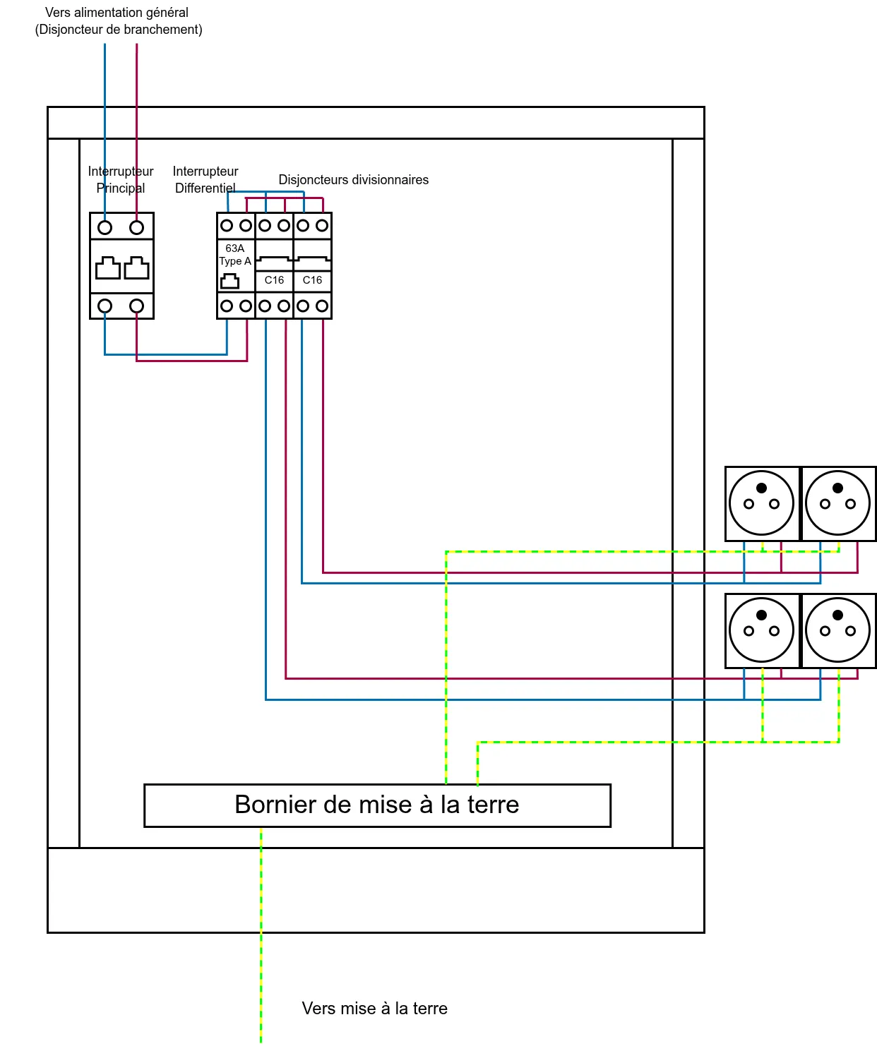 Une fois que c'est fais, vous devez de raccorder le fil de terre des câbles qui viennent des prises au bornier de terre en bas du tableau.